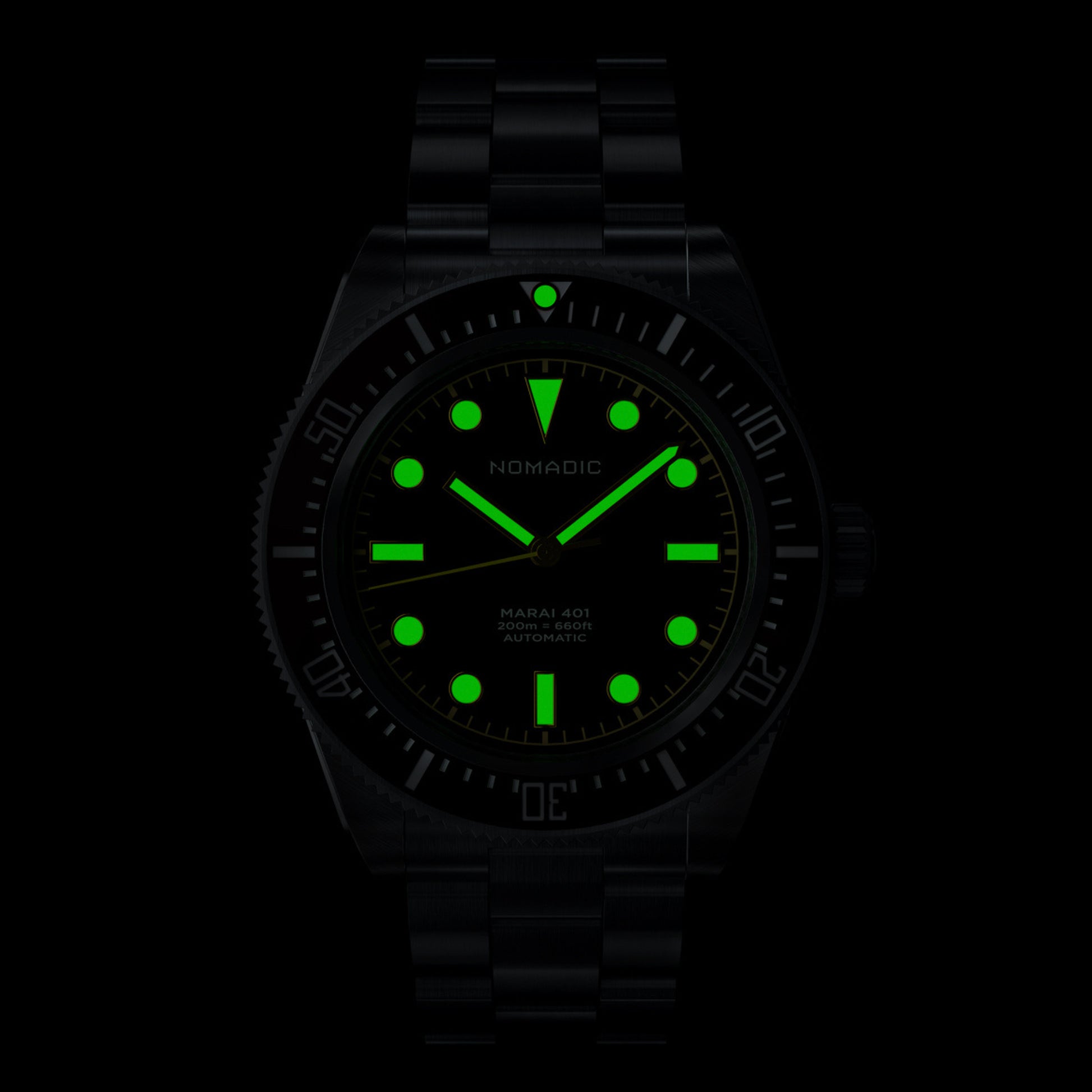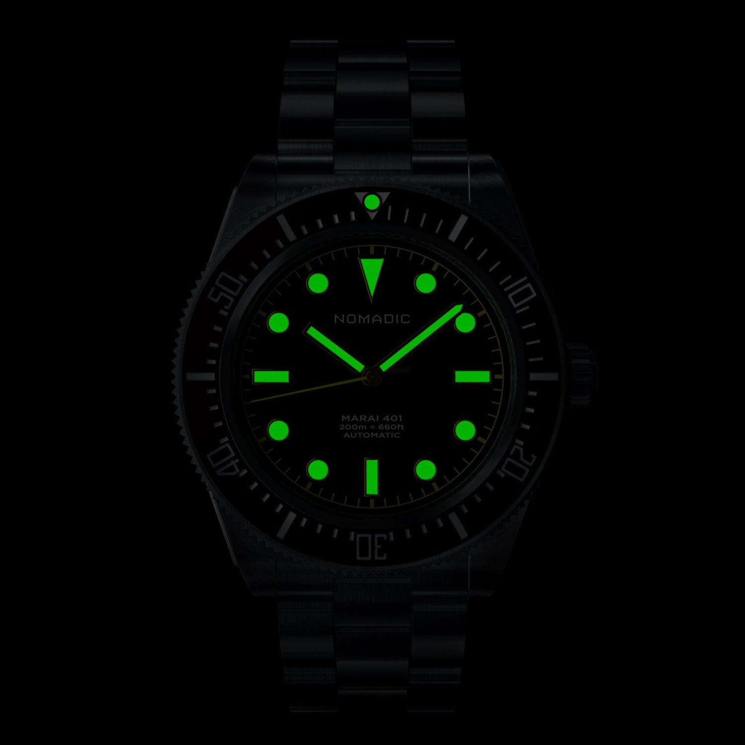 Our phosphorescent hands and dial markers use SuperLumiNova® to release stored light energy slowly, providing vital detail at a glance, even in complete darkness